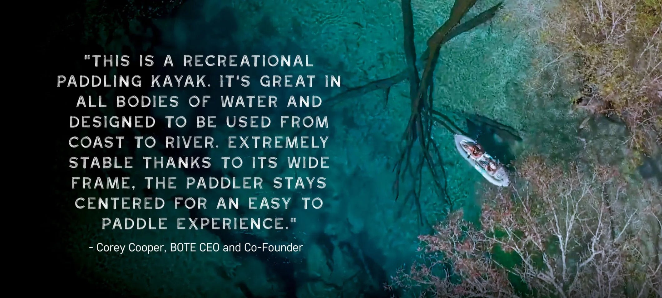 “This is a recreational paddling kayak. It’s great in all bodies of water and designed to be used from coast to river. Extremely stable thanks to its wide frame, the paddler stays centered for an easy to paddle experience.” - Corey Cooper, BOTE CEO and Co-Founder