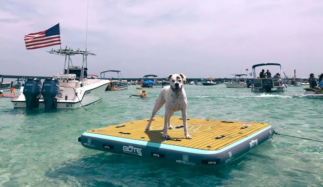 Designed with military-grade PVC skin and a slip-resistant deck, or what we call AeroBOTE construction, whatever size BOTE floating dock you choose ensures your real estate on the water is built to handle even the wildest summer parties or even a two-year-old hopped up on sugar with a couple of furry friends.