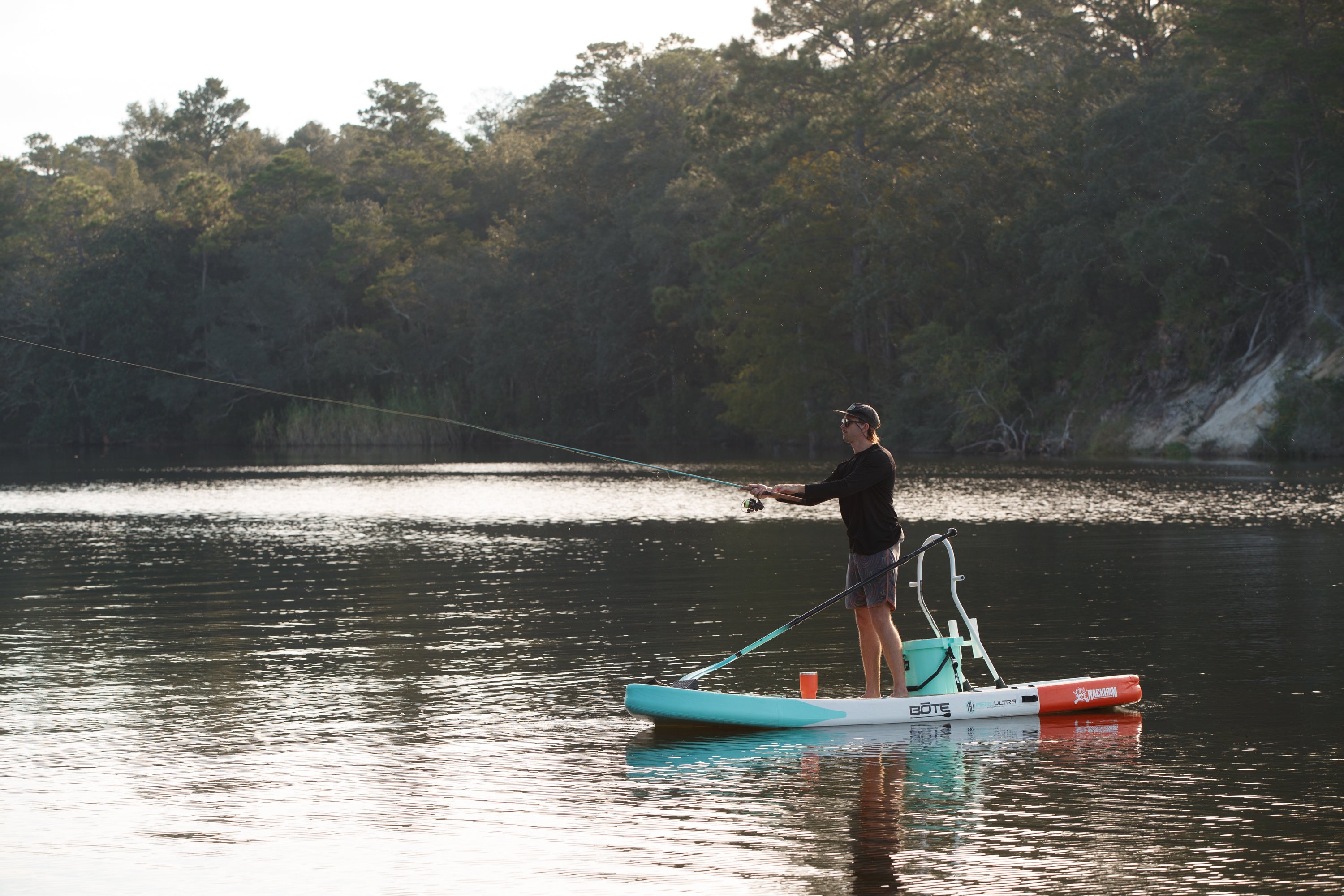 Variety is the name of the game when it comes to selecting your Rackham Aero Inflatable Paddle Board. Keep it traditional with BOTE's signature Classic and Classic Teak designs, both balancing sleek faux wood grain against a seafoam and white color palette. For an added burst of color, the Full Trax Citron incorporates cool gray tones against bright citrus yellow stripes along a full-length deck pad for increased traction. The Bug Slinger™ Dorado is a spectacularly colorful spin on the classic dorado skin, inspired by its namesake, while the Bug Bug Slinger™ Redfish gives a nod to the heritage of redfish. With plenty of designs to choose from, the Rackham Aero is sure to be the ultimate adventure fishing inflatable SUP.