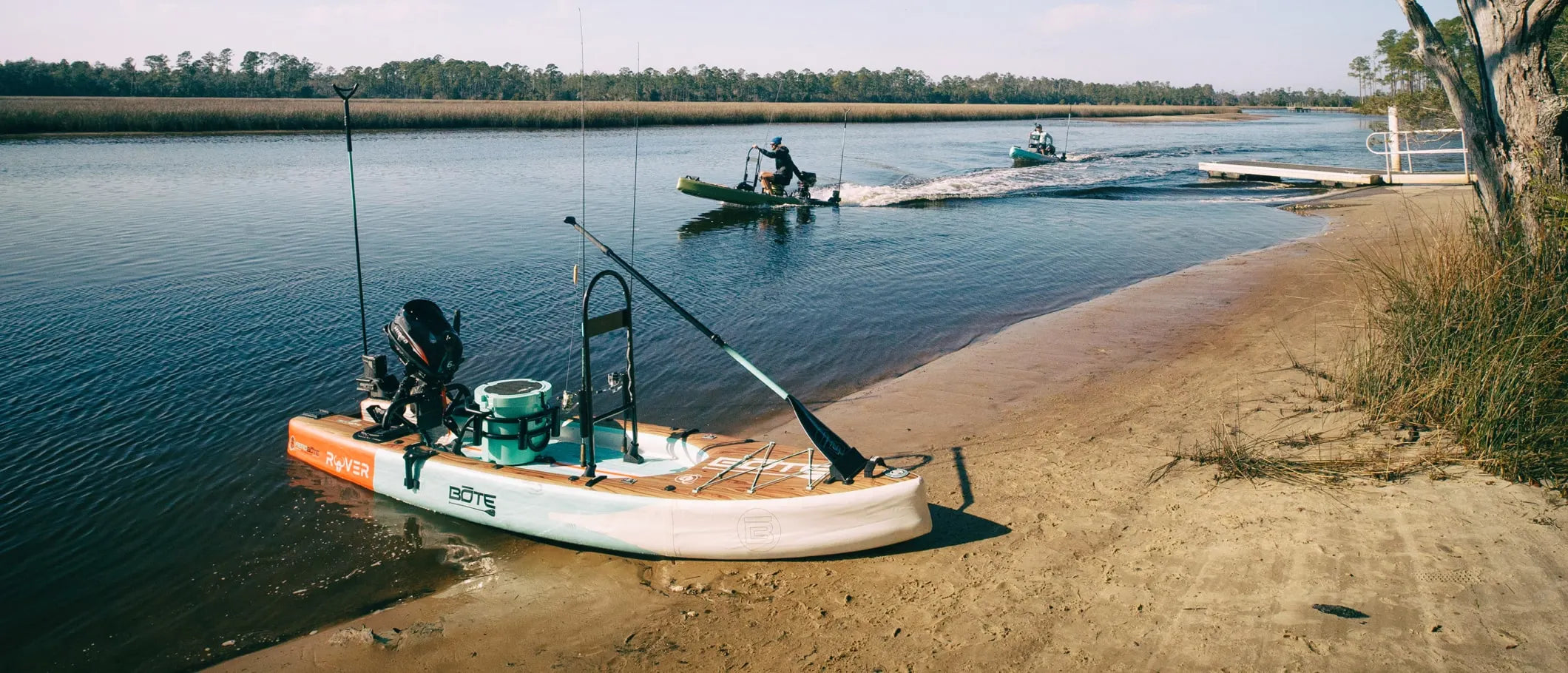 Our solid micro skiff, the BOTE Rover Gatorshell 14′, is nearly three times thicker than a typical paddle board and compatible with our patented removable Moto Rac system. The Rover can carry up to a 9.9 HorsePower motor with a top speed of 18 mph. And, with thicker rails, a displacement nose, and only 3 inches of draft, the Rover absorbs chop, paddles like a dream, and allows you to get to those hard-to-reach places that other boats can’t access.