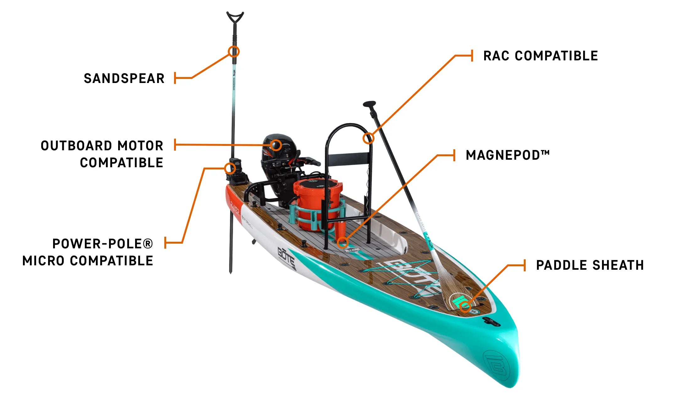With a weight capacity of up to 500 lbs (227kg) and ample deck space, there’s plenty of room to deck out your BOTE Micro Skiff (solid or inflatable) with accessories that help keep your gear secure throughout even the wildest adventures. We’re talking integrated attachment points for securing your paddle, Rac system, Sandspear, and even a MagnePod Tumbler—because we know you’ll get thirsty out there.