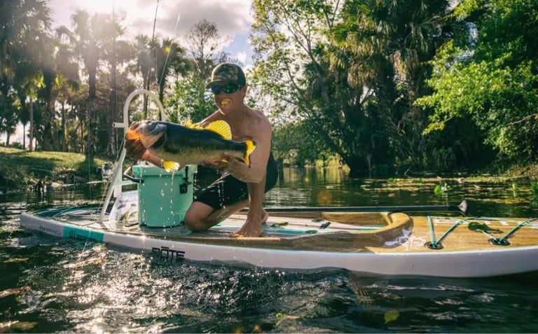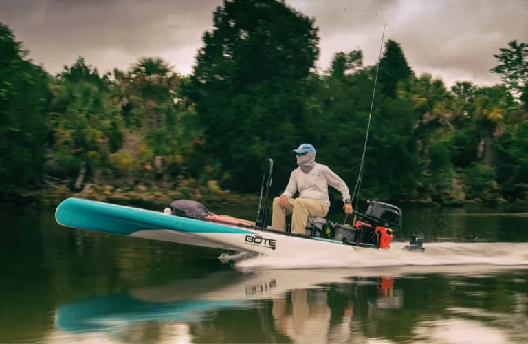 Sometimes the need for speed needs a motor. For that, there's the Rover Micro Skiff. With a sunken cockpit and a lifted nose when under power, this bad boy is the fastest vessel BOTE makes. It can reach speeds of up to 19mph, which means you can go faster and farther than ever before. If you're looking to ramp up your paddle board fishing game, this is the board for you. You can even take a load off by opting for a seated position with a KULA 5 Cooler. Between the seat and the motor, some might wonder if the traditional paddle board experience has been lost. But while they're worrying about that, you can be out there plowing through choppy waters with the wind in your air and a boatload of bass in your cooler. In short, if you want a boat with maximum stability and topspeed that'll turn on a dime and take you deep into unexplored waters, the Rover is fit for the voyage