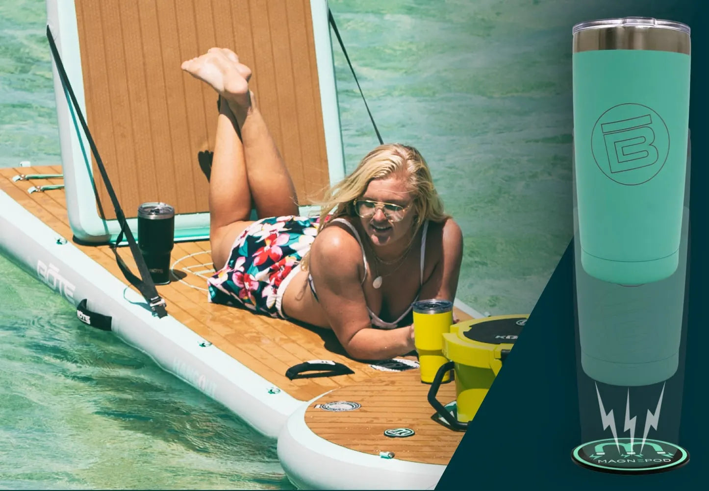 The Hangout Lounge is perfect for a day on the water- comfortable, super stable, and roomy enough to spread out or snuggle up with a kid or a dog! The Magnepod is an excellent addition for keeping your beverage close.
