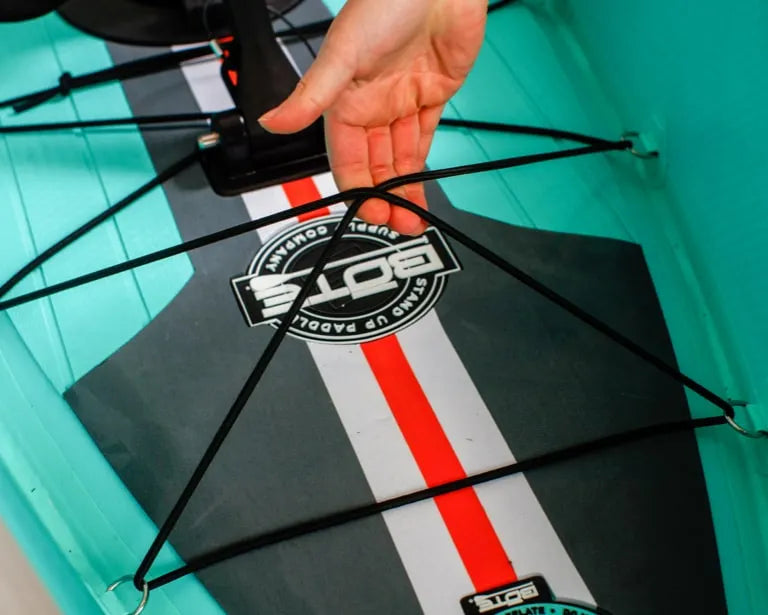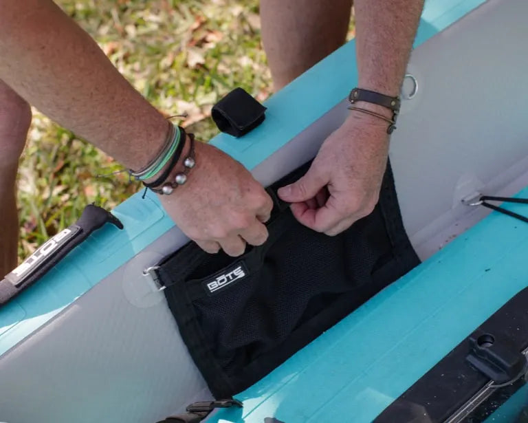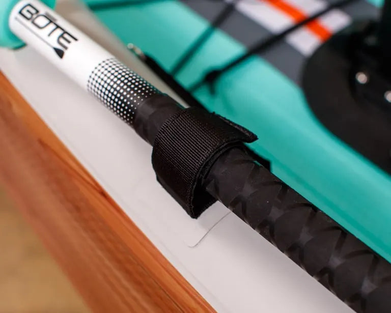 Two sets of velcro paddle straps are located on both the left and right side of the LONO Aero, allowing you to store a sold separately kayak paddle or Sandspear, freeing up space on the floor of the kayak.