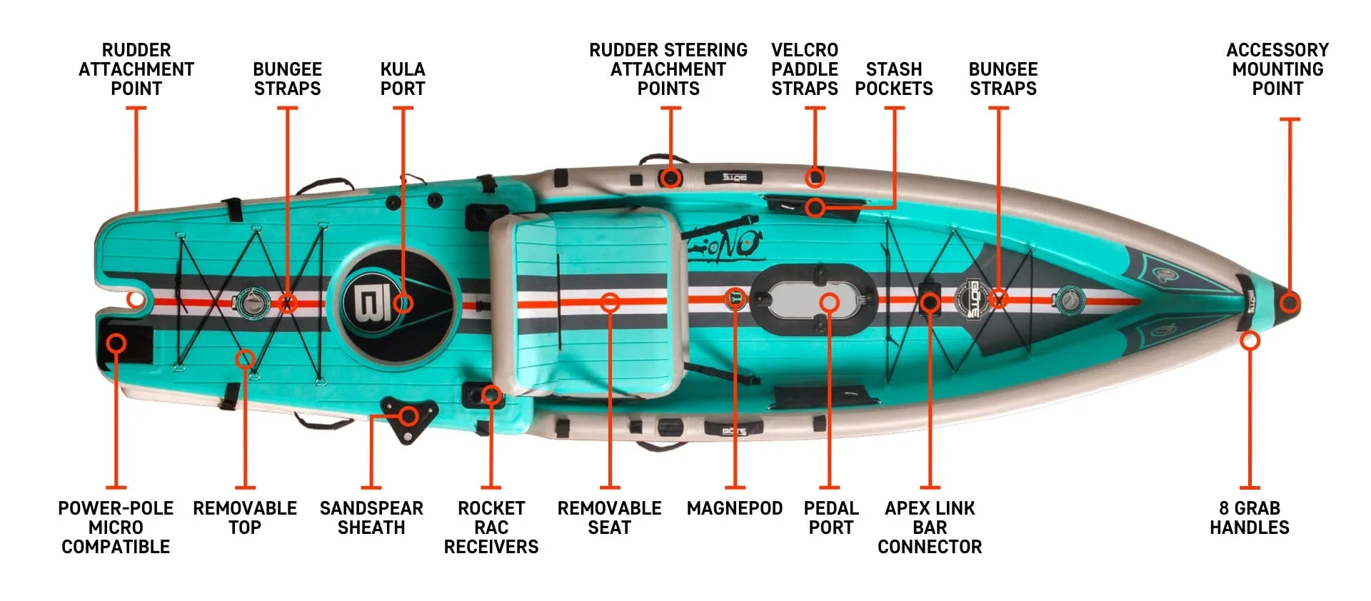 Introducing the reimagined pedal drive compatible LONO Aero 12′6″ Classic Cypress Inflatable Kayak. Whether you're hitting your favorite fishing spots on the weekend, gearing up for a water borne expedition, or just hitting the local launch with your family, it's time to say goodbye to compromise.