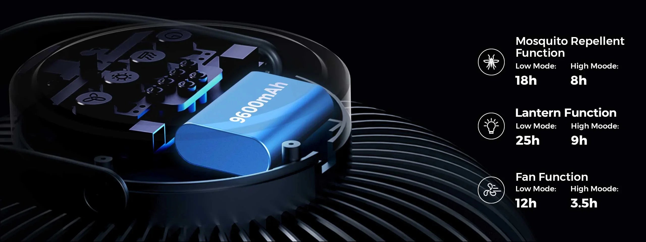 Powered by a 9600mAh large-capacity rechargeable lithium battery, it can be used without wiring restrictions. After fully charged, it can work continuously for 3.5-12hours according to the air volume speed.