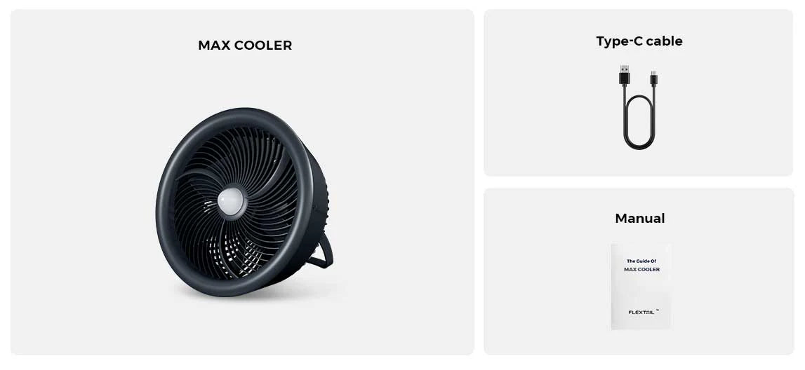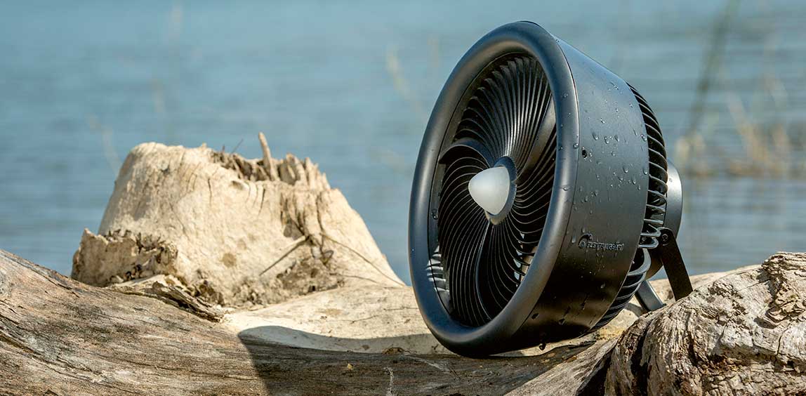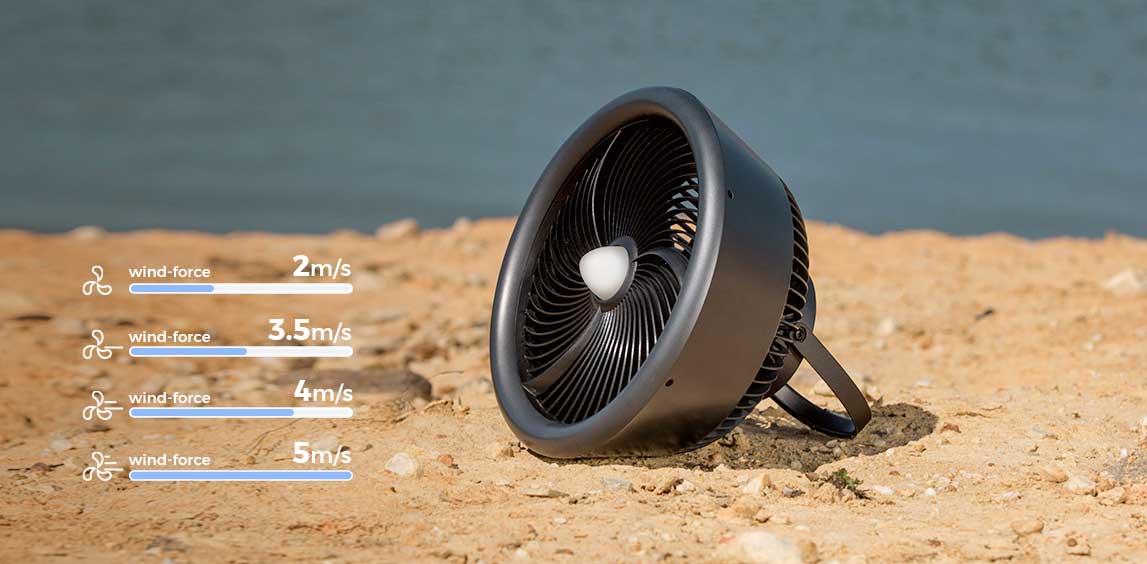 Size of only 24 x 25 x 35cm. MAX COOLER is an outdoor fan with an aircraft engine look, designed to keep your outdoor trip cool - wherever you go. With powerful fan speed, outdoor flashlight & mosquito repeller built-in, emergency power supply, and IPX4 water resistance, MAX COOLER is the perfect portable fan you need for outdoor adventures or travel.